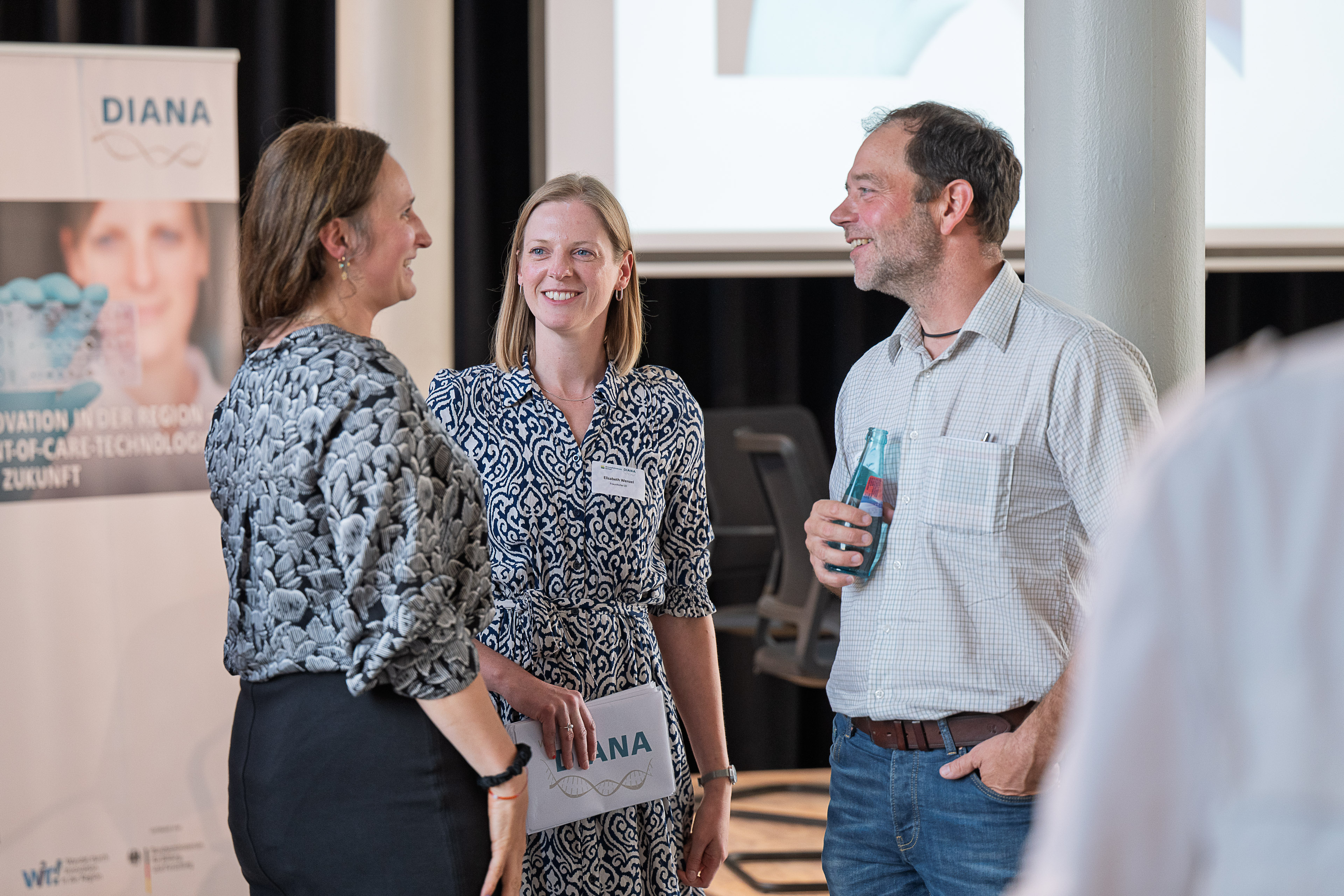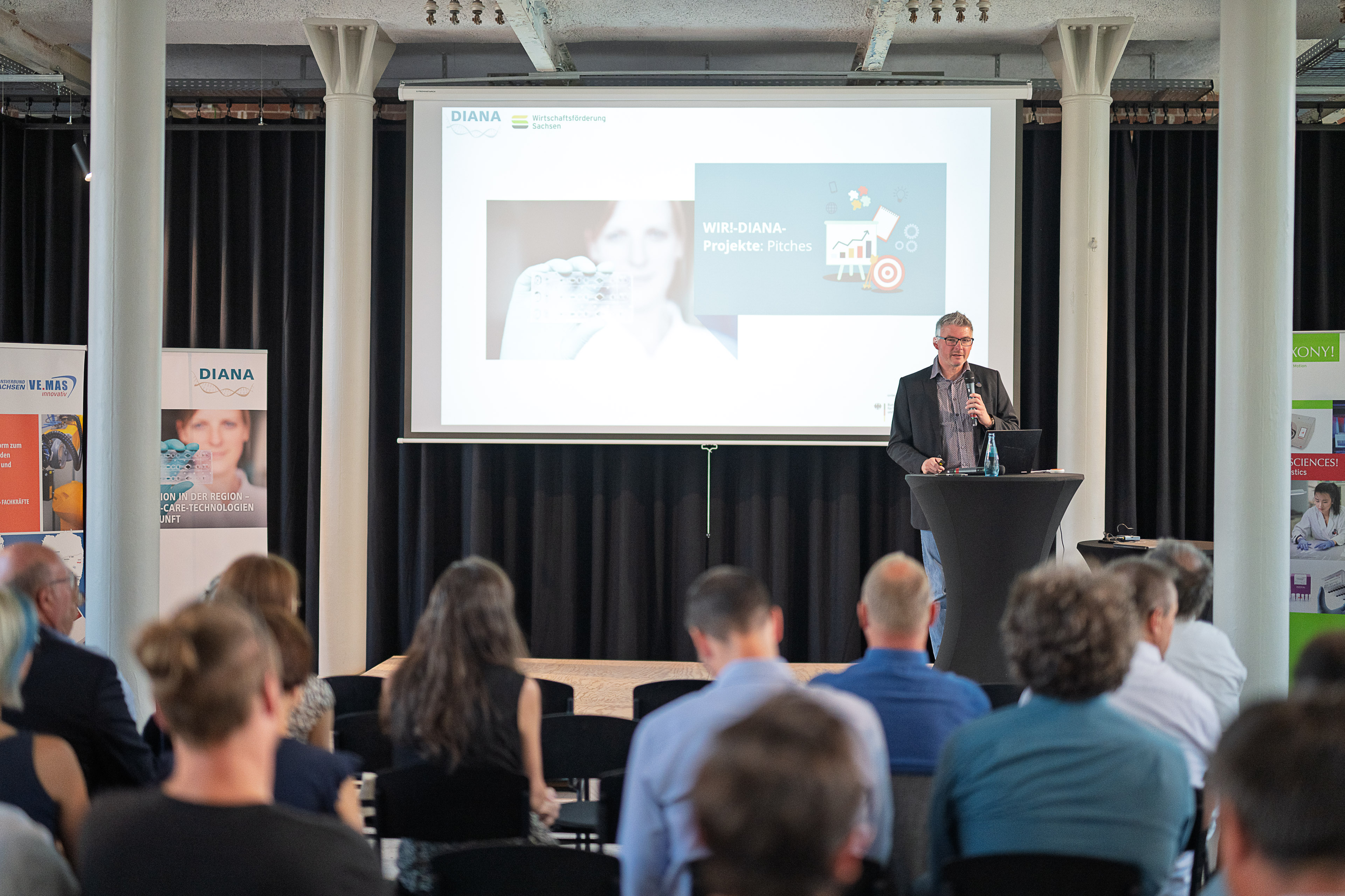 Am 27. August 2025 fand das 4. DIANA-Forum unter dem Titel „Einsatzbereit in Sekunden POCT als Schlüsseltechnologie unter Extrembedingungen“ in der beeindruckenden Eventlocation „Die Fabrik“ in Chemnitz statt. Im Fokus standen praxisnahe Einsatzszenarien von Point-of-Care-Technologien – vom Leistungssport über Rettungseinsätze und Notfallmedizin bis hin zur Nutztierdiagnostik. Das Forum brachte Expert:innen aus Medizin, Sportwissenschaft, Landwirtschaft, Technik, Forschung und Wirtschaft zusammen und spannte damit einen interdisziplinären Bogen, der die Stärke des DIANA-Bündnisses deutlich zeigte: Diagnostik dorthin zu bringen, wo sie gebraucht wird – schnell, zuverlässig und unter realen Einsatzbedingungen. In Impulsvorträgen und einer Podiumsdiskussion diskutierten u. a. Christopher Pöhlmann (EKF Diagnostics), Robert Zickert (Chemnitzer FC), André Pollmächer (ehem. Hochleistungssportler Leichtathletik), Enrico Sieber, Prof. Dr. Andreas Fichtner (Zeisigwaldkliniken Bethanien) und Stephan Nüsser (SNDC GmbH) über aktuelle Anforderungen und Innovationspotenziale. Dabei wurde sichtbar, wie vielfältig POCT-Anwendungen heute schon sind – von Wearables und Schnelltests bis zu textilintegrierten Sensoren. Zuvor stellten aber mehrere DIANA-Projektteams ihre Entwicklungen in einer Begleitausstellung vor und zeigten eindrucksvoll, wie nah die laufenden Projekte bereits an realen Anwendungsszenarien ausgerichtet sind. Das Forum markierte gleichzeitig die Halbzeit der aktuellen Förderphase. In einer Zwischenbilanz wurden Fortschritte, Bedarfe und neue Transferperspektiven zur weiteren Stärkung der regionalen Innovationskraft diskutiert.